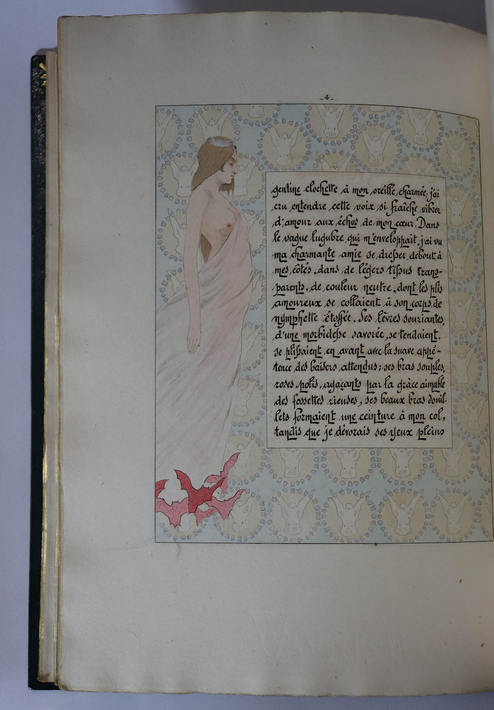 Et vous objets qu'elle aimait, livres d'amour que nous lisions ensemble, gravures friponnes, statuettes légères de Saxe, petits miroirs qui doubliez sa beauté ; glaces qui reflétiez nos plaisirs, je vous contemple avec ivresse et ne puis vous quitter. Larges divans, coussins moelleux, tapis d'Orient, tête à tête évocateur de caresses, toi surtout lit babillard; vous tous, Meubles, champs de bataille de nos tournois d'amour, vous qui me vîtes tour à tour Hercule et Adonis, amant vainqueur et amoureux vaincu, vous resterez toujours mon bien, ma possession, car avec elle et dans votre confort j'ai oublié la vie, car sur vous j'ai sablé le bonheur dans le hanap des voluptés, sur vous aussi j'ai semé avec insouciance, ma jeunesse et mon sang, ma cervelle et mon âme, le meilleur de mon moi, ma sensibilité du coeur et ma virilité des sens.